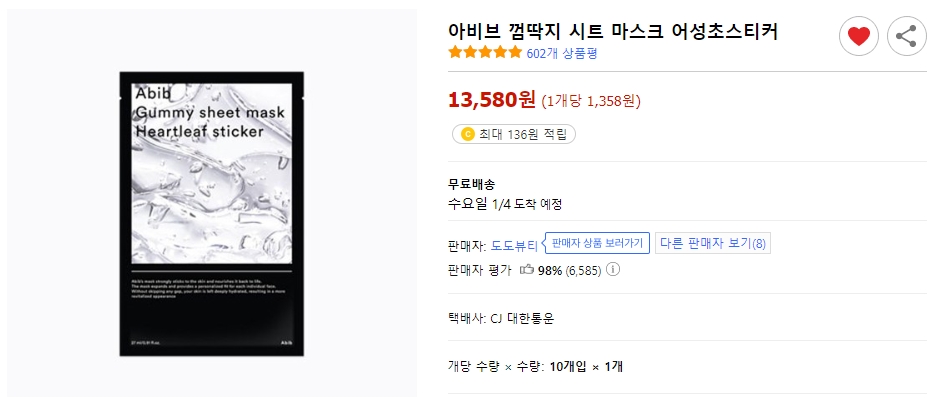 그렇게 매번 새로운 마스크팩을 구매하던 중에 발견한 마스크 팩이 바로 아비브 껌딱지 시트 마스크 어성초스티커!