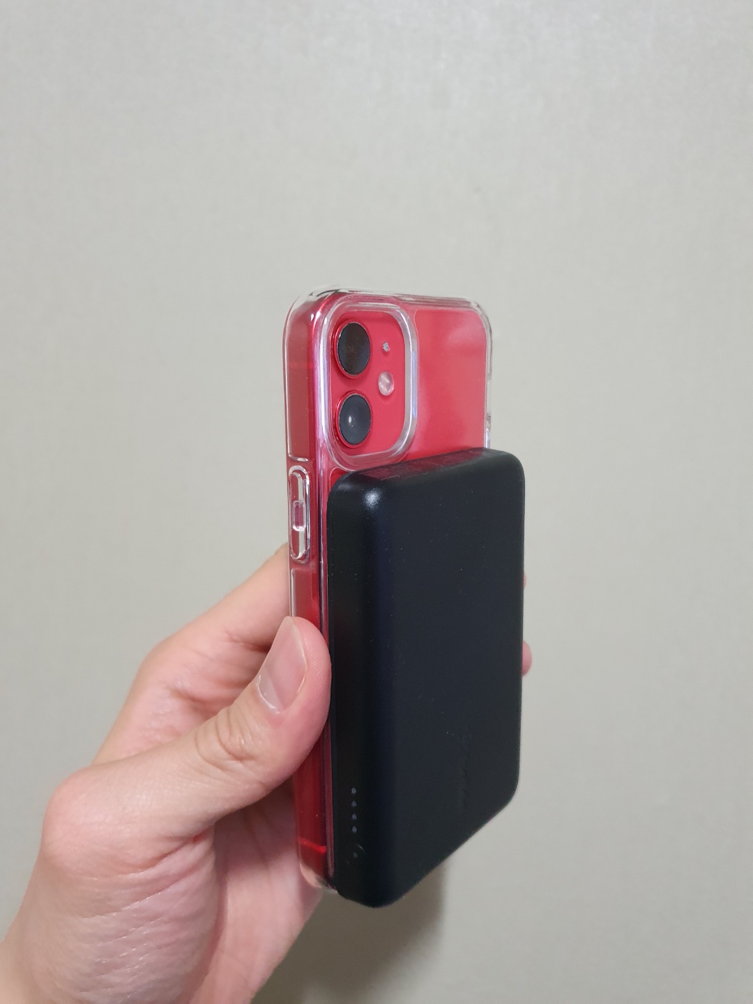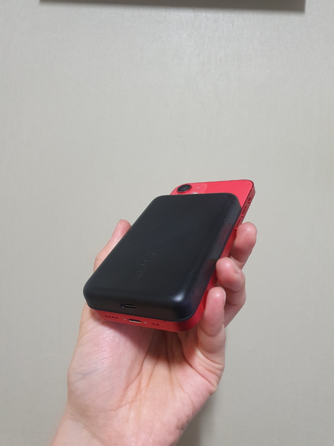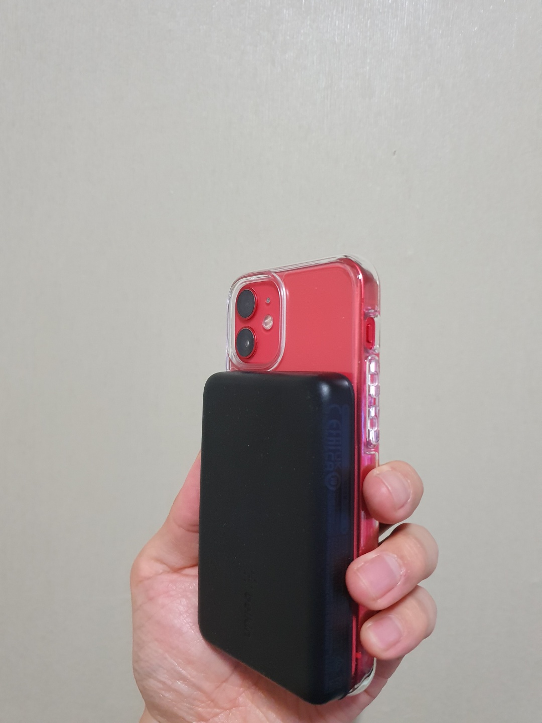 아이폰 12 미니에 보조배터리 부착한 모습입니다.