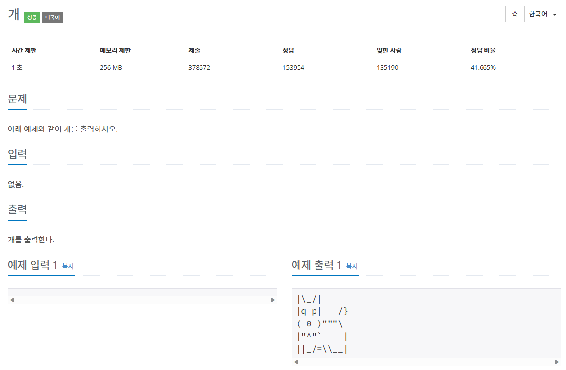 문제 아래 예제와 같이 개를 출력하시오. 입력 출력 예제 입력 1 복사 예제 출력 1 복사 |\_/| |q p| /} ( 0 )"""\ |"^"` | ||_/=\\__|...