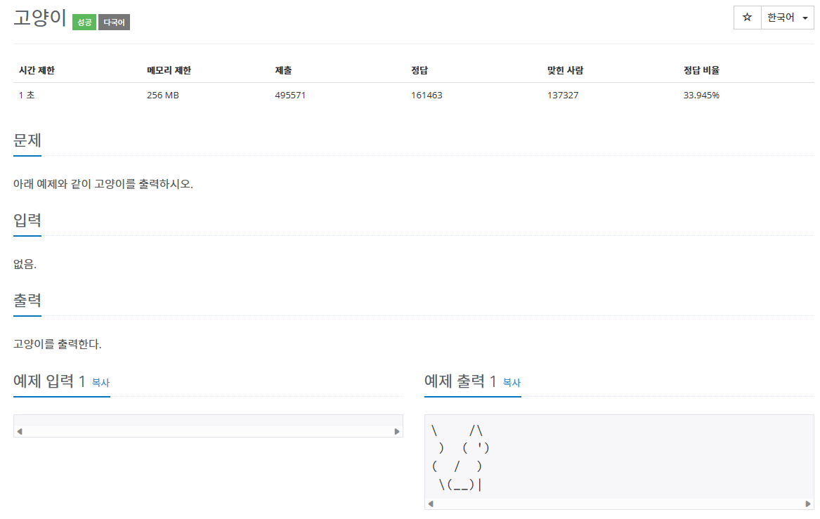 백준 사이트의 단계별로 풀어보기 (단계별로 풀어보기 (acmicpc.net)) 첫번째인 입출력의 마지막 두 문제인 고양이와 개 입니다. 이 두 문제는 특수문자를 출력하는 방법에 대한 풀이입니다. 타 언어에 비하면 파이썬은 매우 쉬운편입니다.